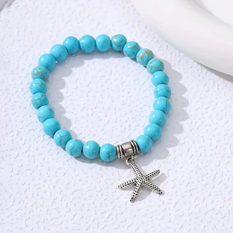 14pcs Elegante pulsera de cuentas turquesas con dije de estrella de mar y cuentas de resina