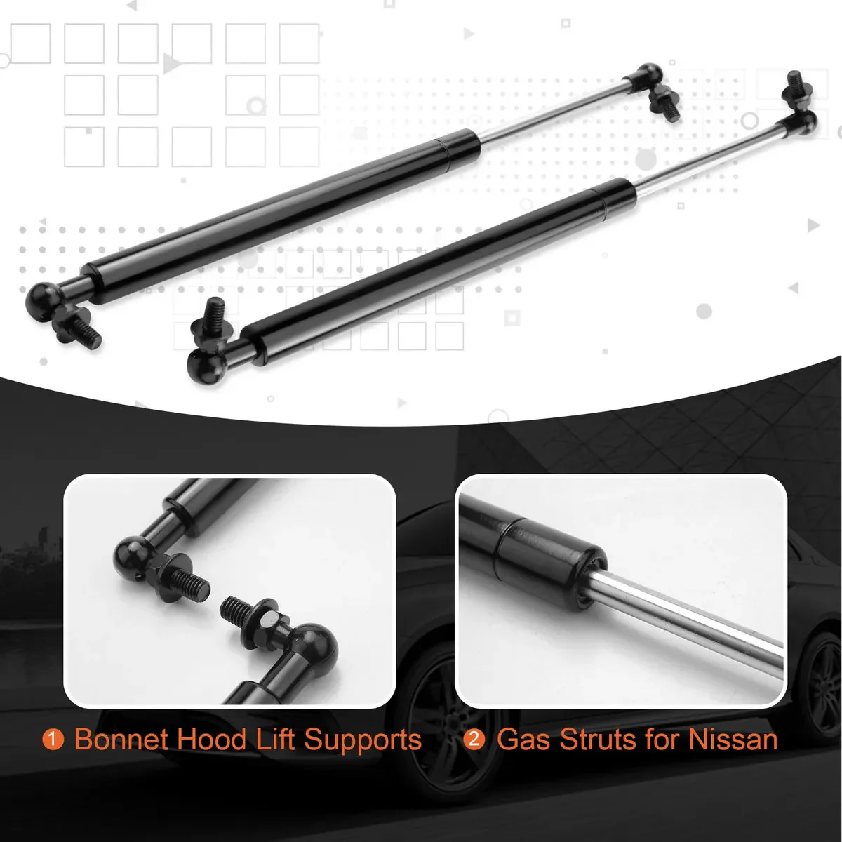 Soportes de elevación de capó fabricados con materiales resistentes que proporcionan estabilidad y seguridad durante trabajos de mantenimiento vehicular. Estos puntales permiten mantener el capó elevado de forma segura, liberando ambas manos para realizar reparaciones y inspecciones con comodidad. Ideales para mecánicos profesionales y entusiastas del automóvil que buscan soluciones prácticas y duraderas. El conjunto de 2 piezas garantiza soporte equilibrado en ambos lados del vehículo.