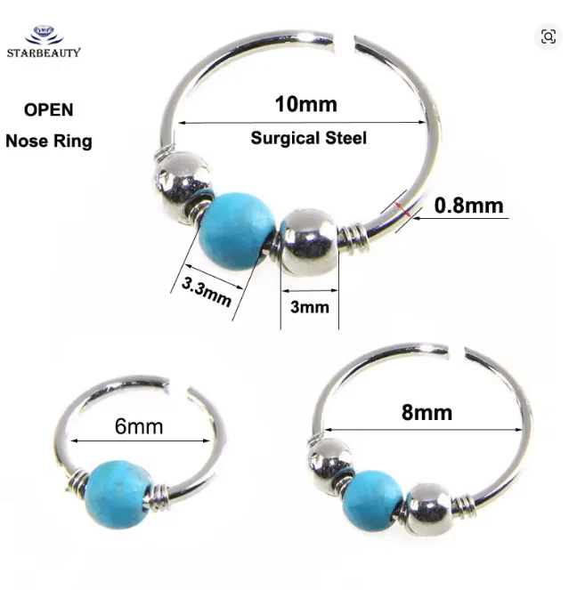Este anillo de nariz de 6 mm en color plateado está diseñado para piercings de tabique y Daith, ofreciendo un ajuste cómodo y seguro. Su acabado metálico aporta un estilo sofisticado y duradero, ideal para quienes buscan un accesorio discreto pero elegante. Perfecto para uso diario, combina resistencia y estética en una pieza minimalista.