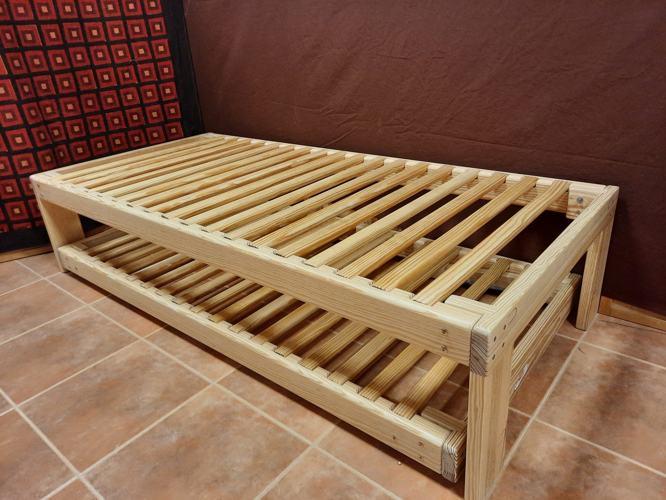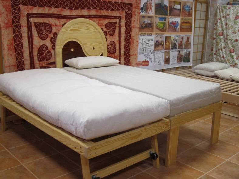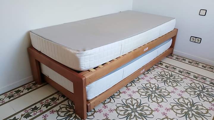 Cama nido de 90 x 200 superior / 90 x 190 inferior, con ruedas y patas elevables.