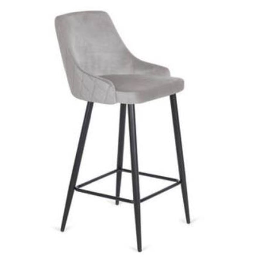 Taburete tapizado en tela velvet, en colores gris o dorado, ambos con costuras en rombo en la parte trasera. Patas negras.