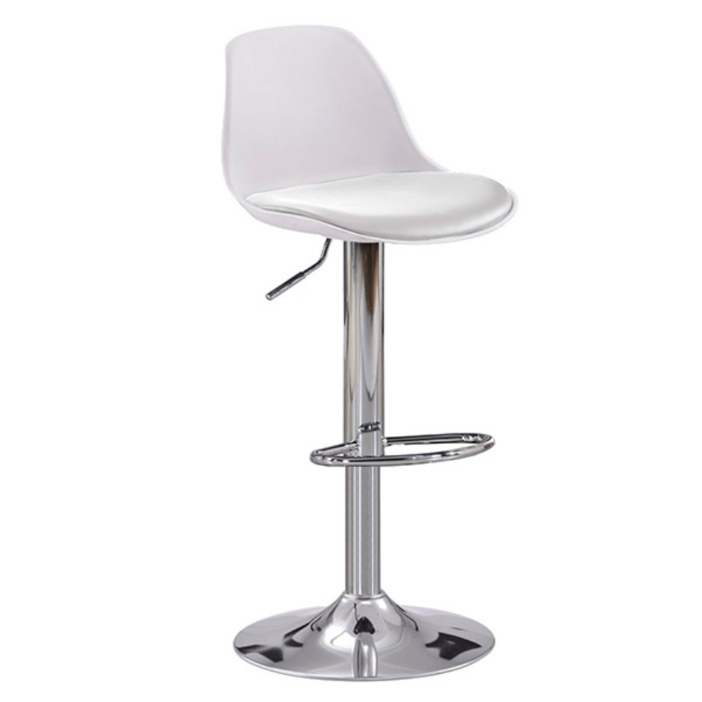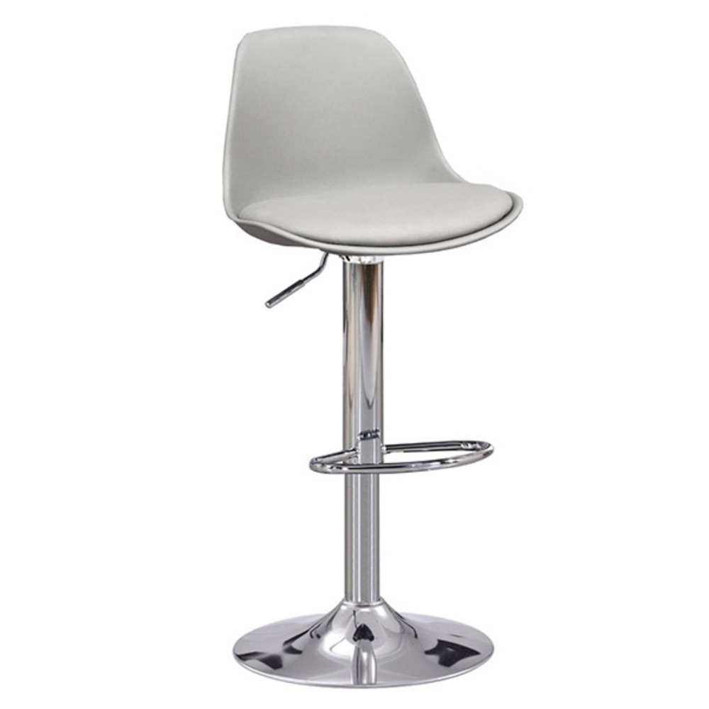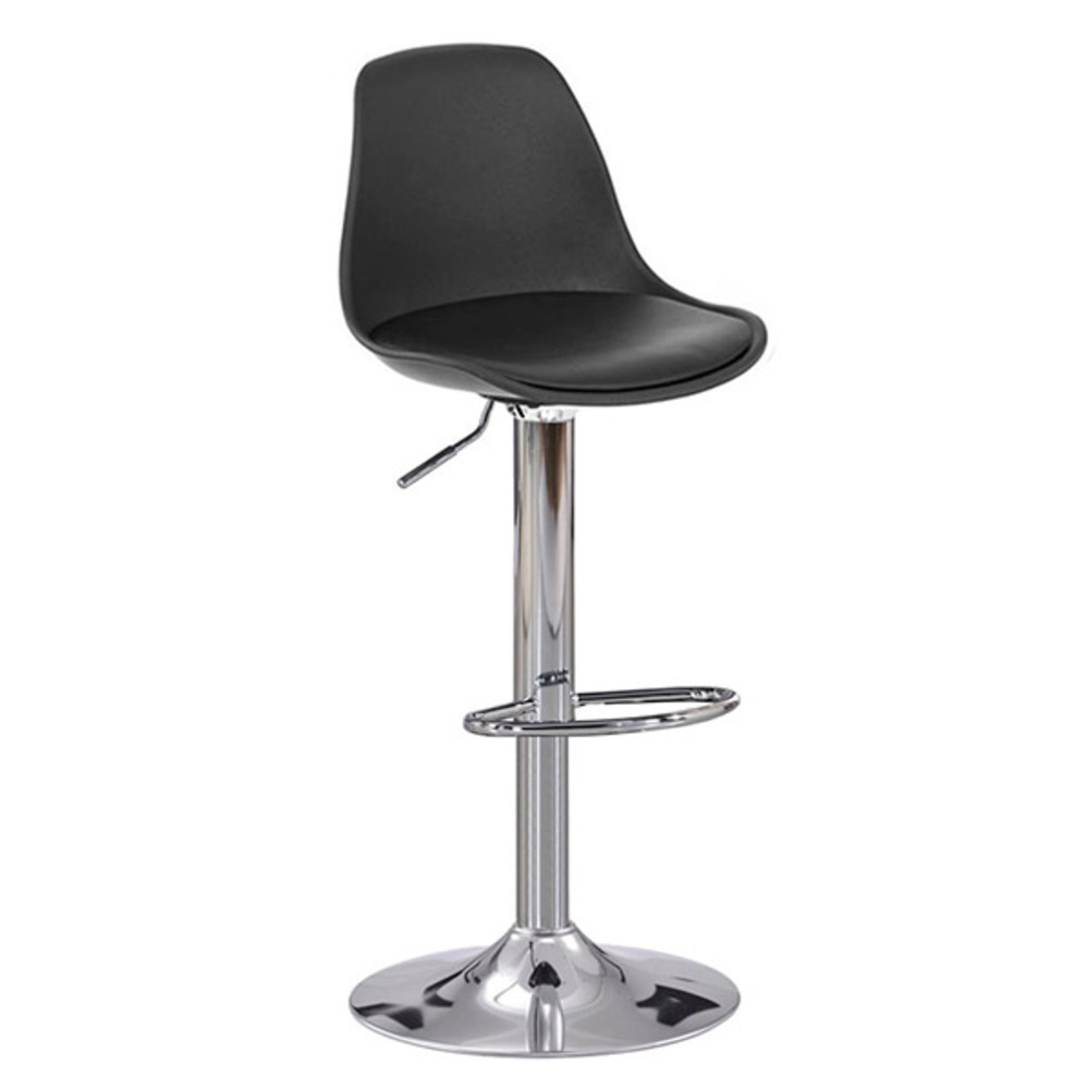 Taburete de altura regulable a gas, cojín tapizado en polipiel. Pata, reposapies y base Cromadas.