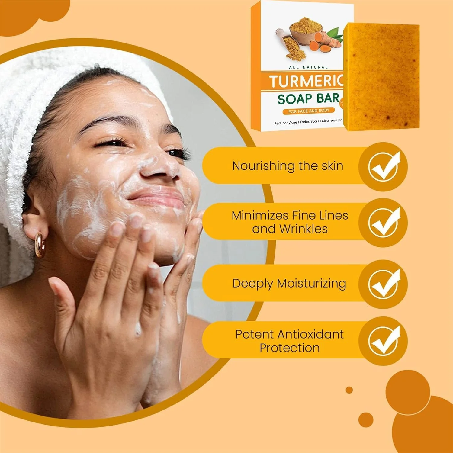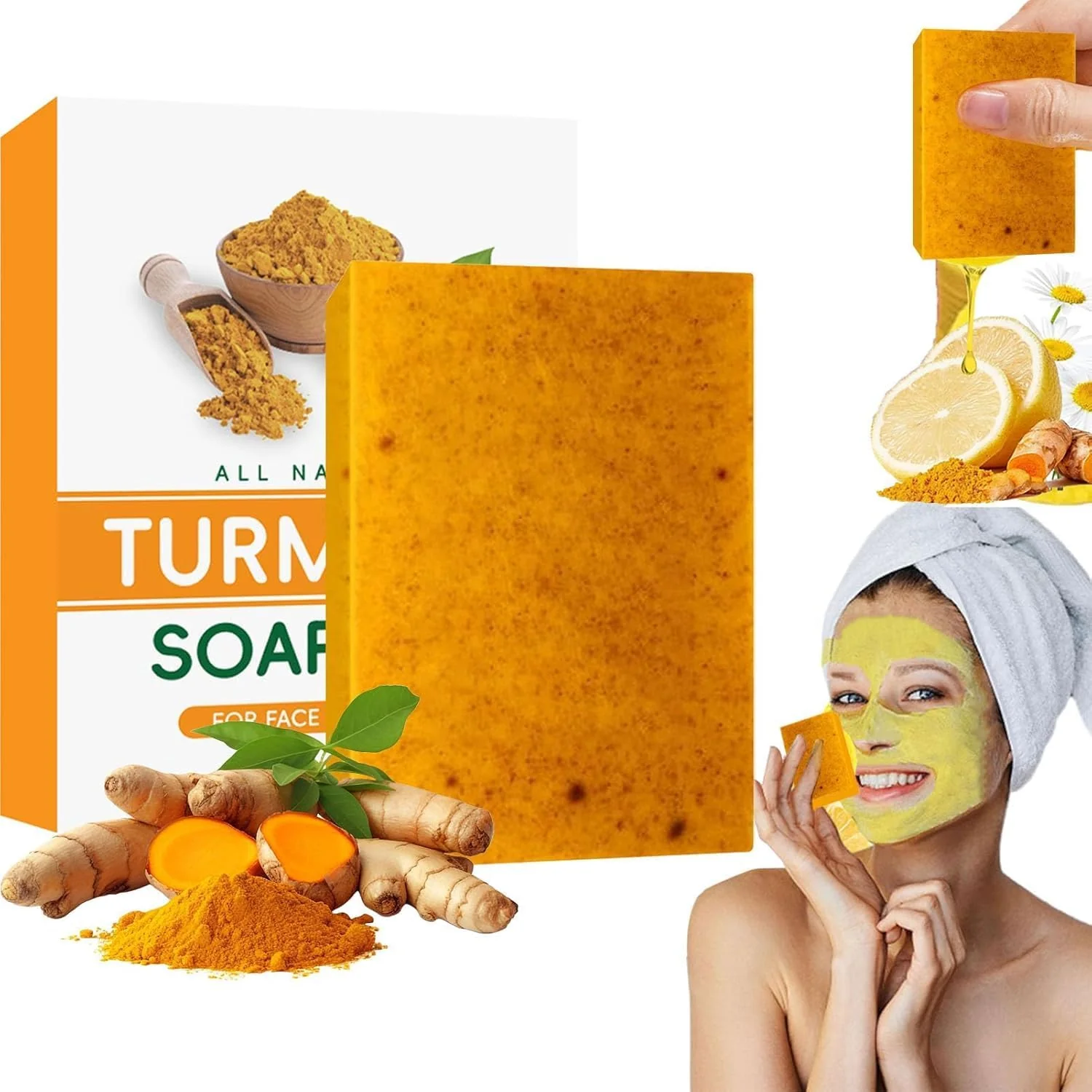 - 【Hidratación intensa】Enriquecida con humectantes naturales, la barra de jabón de cúrcuma hidrata y nutre profundamente la piel, previniendo la sequedad y restaurando su suavidad. ¡Dile adiós a la piel escamosa y opaca!
