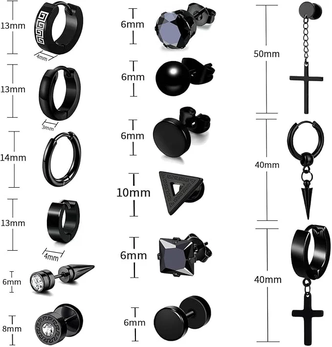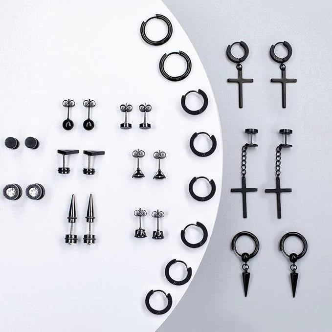 Este juego incluye 24 pares de aretes de acero inoxidable negro, diseñados para hombres y mujeres que buscan un estilo moderno y versátil. Cada pieza, con un diseño de piercing de cruz, ofrece durabilidad y resistencia a la corrosión, perfecta para uso diario. Su acabado en negro mate aporta un toque sofisticado y contemporáneo que complementa cualquier look con discreción y elegancia. Ideal para quienes valoran la calidad y el diseño en su joyería.