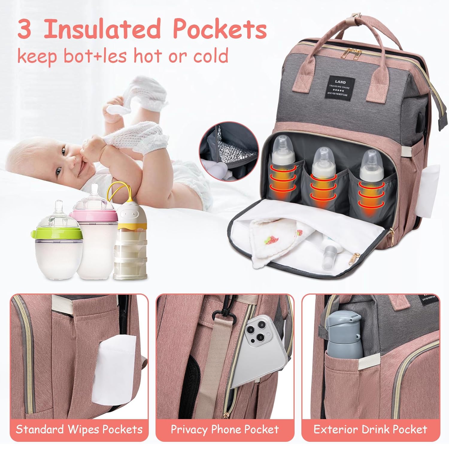 - 【Transporte multimodal】: transición con facilidad de una elegante mochila para pañales a un cambiador portátil o incluso a una cuna cómoda. Con correas compatibles con cochecito, esta bolsa es el compañero perfecto para viajes, compras o recados diarios, asegurando que todo lo que necesitas sea accesible y seguro.