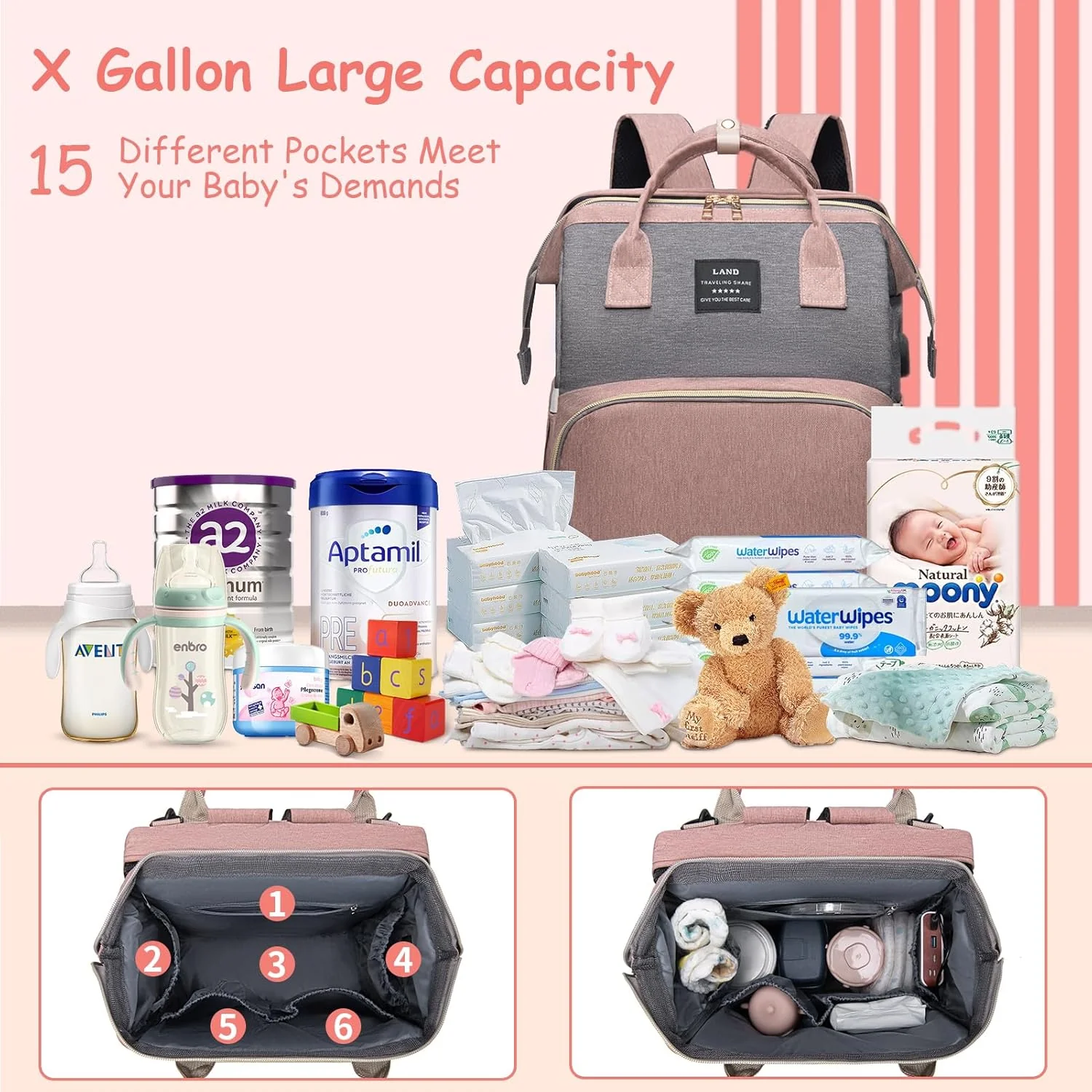 - Diseño duradero y listo para la tecnología: nuestra bolsa de pañales con cambiador está diseñada con un tejido resistente e impermeable para cualquier clima. Un salvavidas para padres modernos, cuenta con un puerto de carga USB y auriculares, lo que te permite mantenerte conectado y encendido durante tus aventuras familiares.