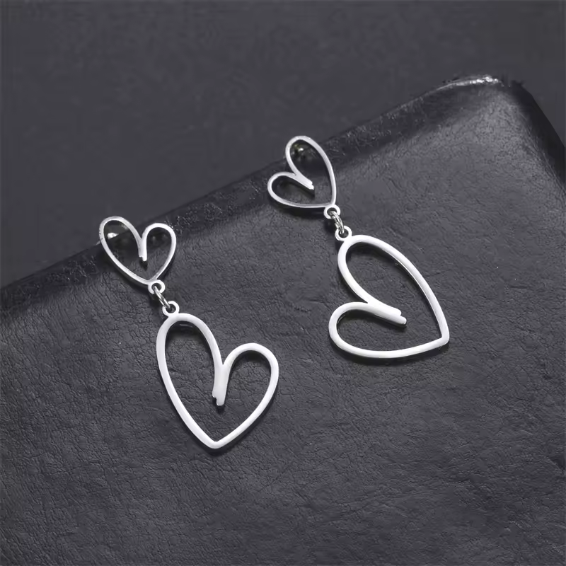 Pendientes de aro confeccionados en acero inoxidable quirúrgico, diseñados con dos corazones delicados que cuelgan elegantemente. Este material garantiza durabilidad y resistencia a la corrosión, ideal para pieles sensibles. Los corazones añaden un toque romántico y femenino a cualquier conjunto, desde casual hasta formal. Perfectos como regalo significativo o para complementar tu colección de joyería diaria. Hipoalergénicos y de fácil mantenimiento.