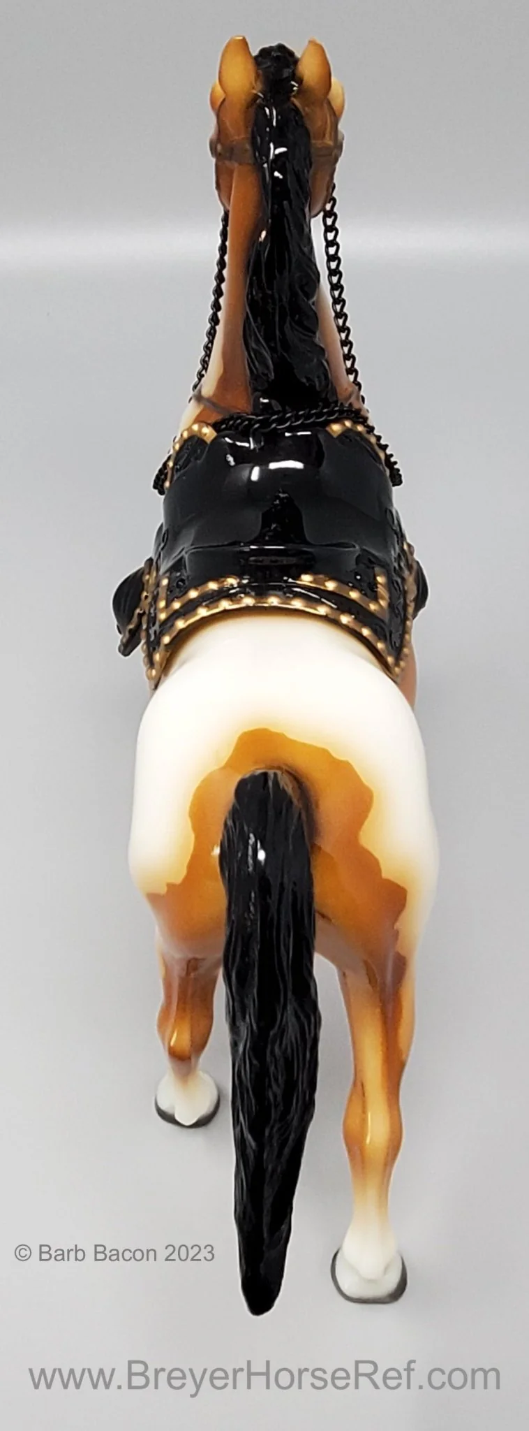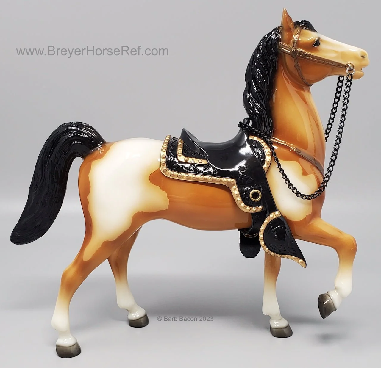 Tobiano color miel bayo brillante con silla de montar negra de estilo antiguo con cierre a presión y riendas de cadena negras o doradas (no estoy seguro de si una es más inusual). Edición limitada de lanzamiento retro. En la lista de retirados de 2012.