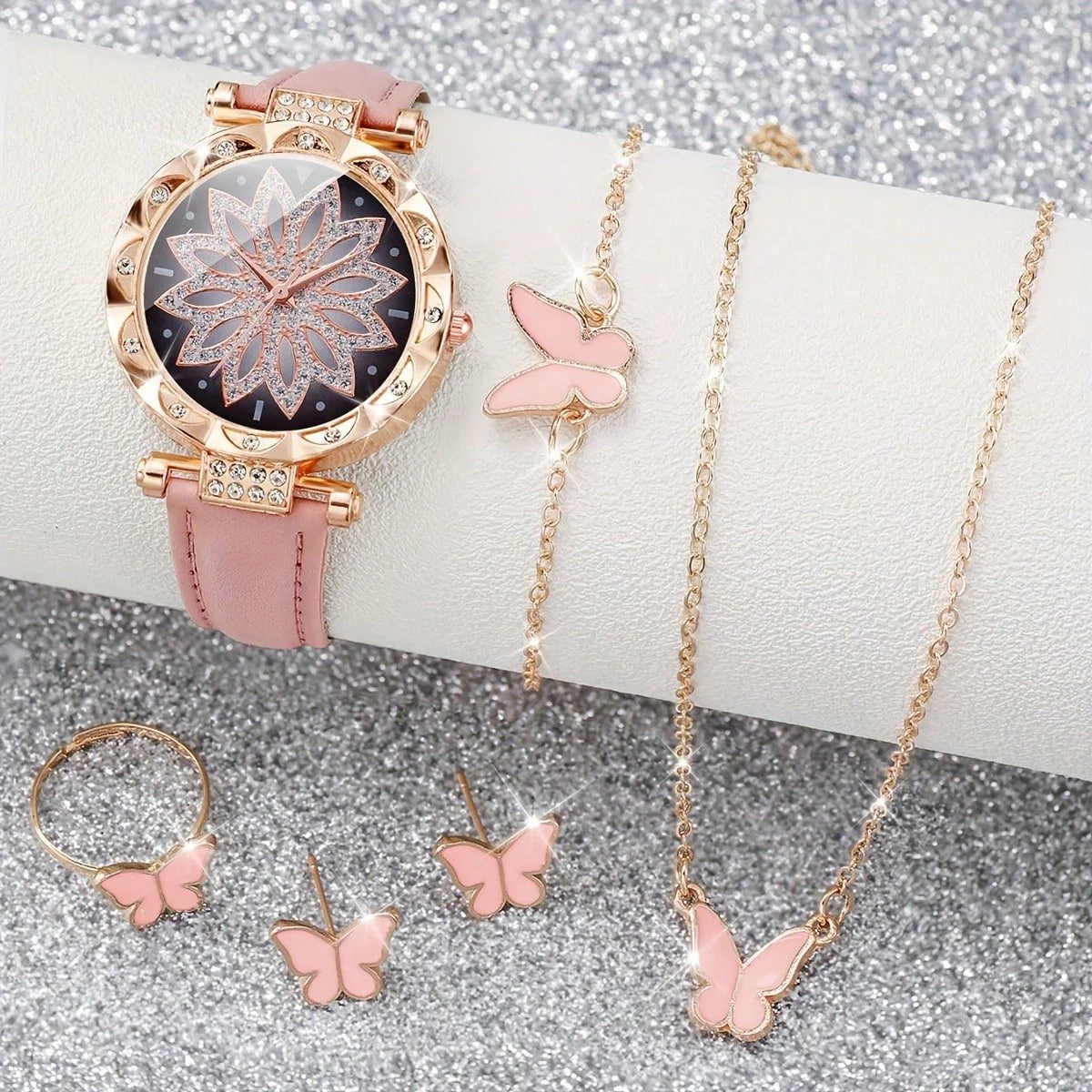 Este conjunto de 6 piezas para damas incluye un reloj de cuarzo con correa elegante, un collar con dijes de mariposa y estrella, una pulsera decorada con mariposas, un anillo y aretes a juego. Cada pieza está diseñada para complementar tu estilo con detalles delicados y sofisticados, ideales para cualquier ocasión. La precisión del reloj y la armonía del conjunto realzan tu imagen con un toque femenino y moderno.