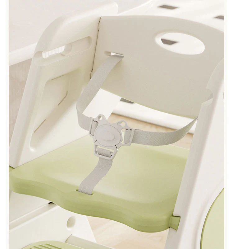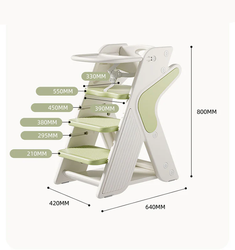 Incluye cinturón de seguridad, bandeja removible y peldaños antideslizantes. Fabricada con materiales resistentes y fáciles de limpiar, soporta hasta 35 kg sin perder estabilidad ni comodidad.