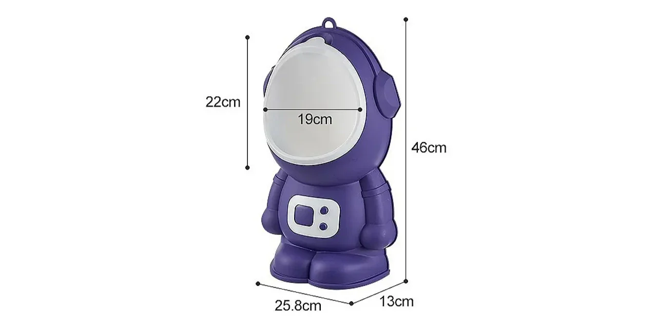 Haz del aprendizaje del baño una experiencia divertida y cómoda con nuestro urinario espacial. Su adorable diseño convierte la rutina del pipí en un momento alegre para tu peque. Incluye recipiente extraible. Ideal para anclar directamente a la pared según la estatura de tu hijo. Ideal para niños mayores de 2-3 años.